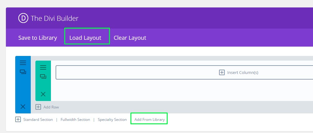 To load the layouts you stored in the library previously, choose "Your saved layouts". Also, there is a new tab now, "Divi Den on Demand". You can load the layouts directly from the page too.