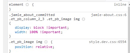 It lists all the CSS code for this image, such as the display and width. And it also tells me that this very code is located inside the jamie-about.css on the line 6.