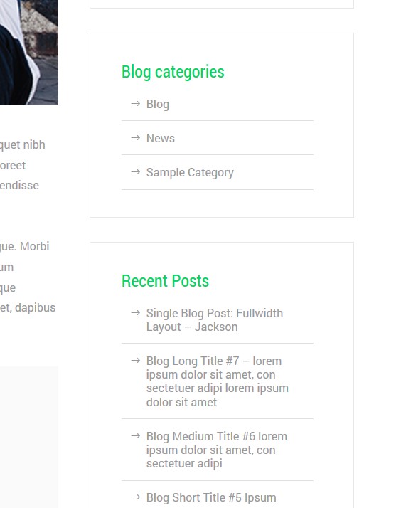 Our goal here is to achieve this look of the sidebar, with Blog Categories and Recent Posts widgets in it: