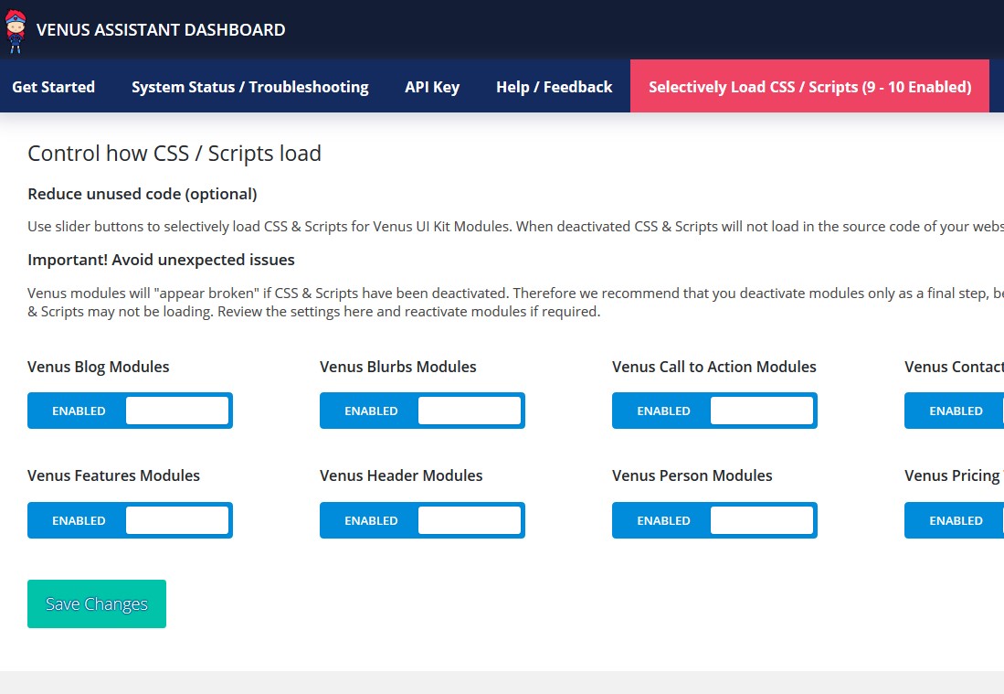 Go toSettings**>** Venus**> Selectively load CSS / Scripts