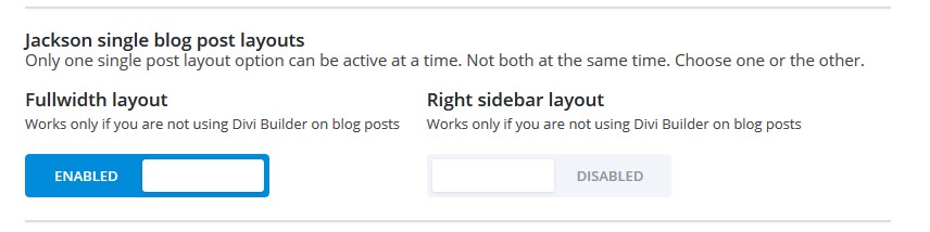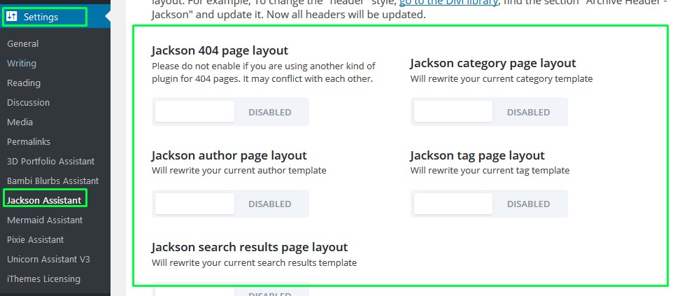 The Jackson Pack comes with a new features that you can activate on your site. This includes special layouts for these pages: single blog post, category, author, tags, search results and 404. To find these options, go to Dashboard Menu->Settings->Jackson Assistant: