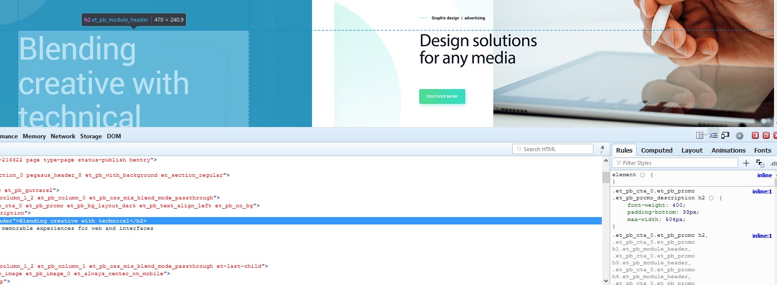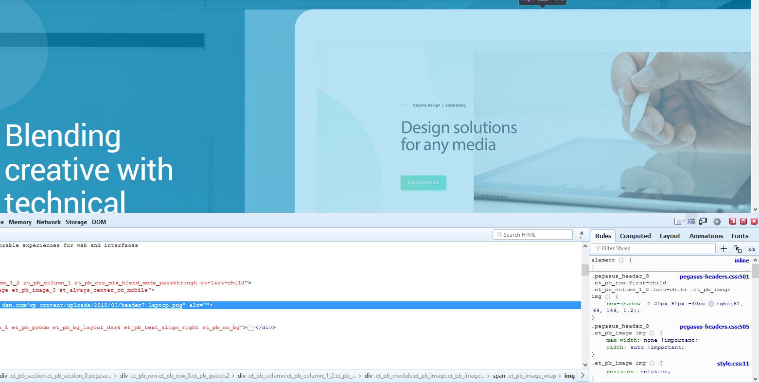 In the example below, selecting this header image informs me that there is some CSS written in the pegasus-heders.css file. Also, it tells me the exact line number. So if I go to pegasus-header.css file and scroll to line 501, i can see there box-shadow CSS, or width related CSS if I go to line 505, as shown on the screenshot.