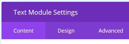 When you open any module settings you will see 3 tabs with 3 different groups of options: Content tab, Design Tab and Advanced tab.