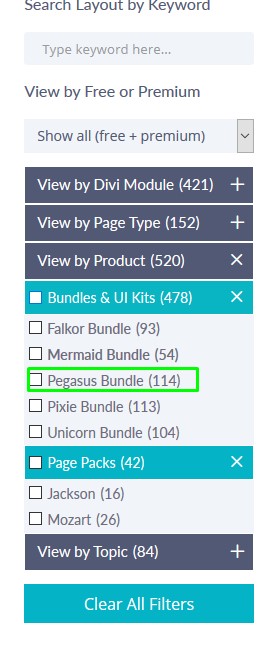 First thing you want to do is to filter only Pegasus layouts and you can do that by toggling View by Product option and then checking only Pegasus Bundle: