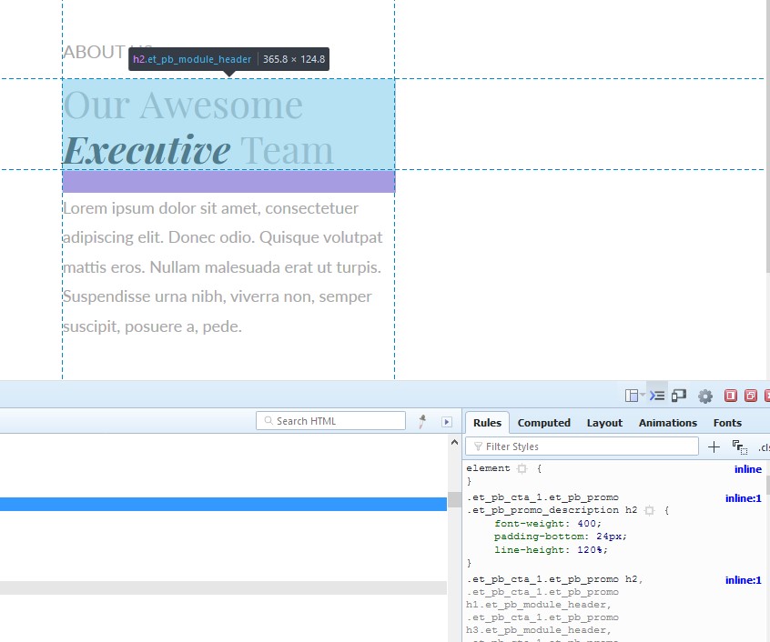 In this example, I selected a title text using inspect element tool. What I can see in Rules tab, on my right, is some CSS that shows font weight, padding and line height rules.