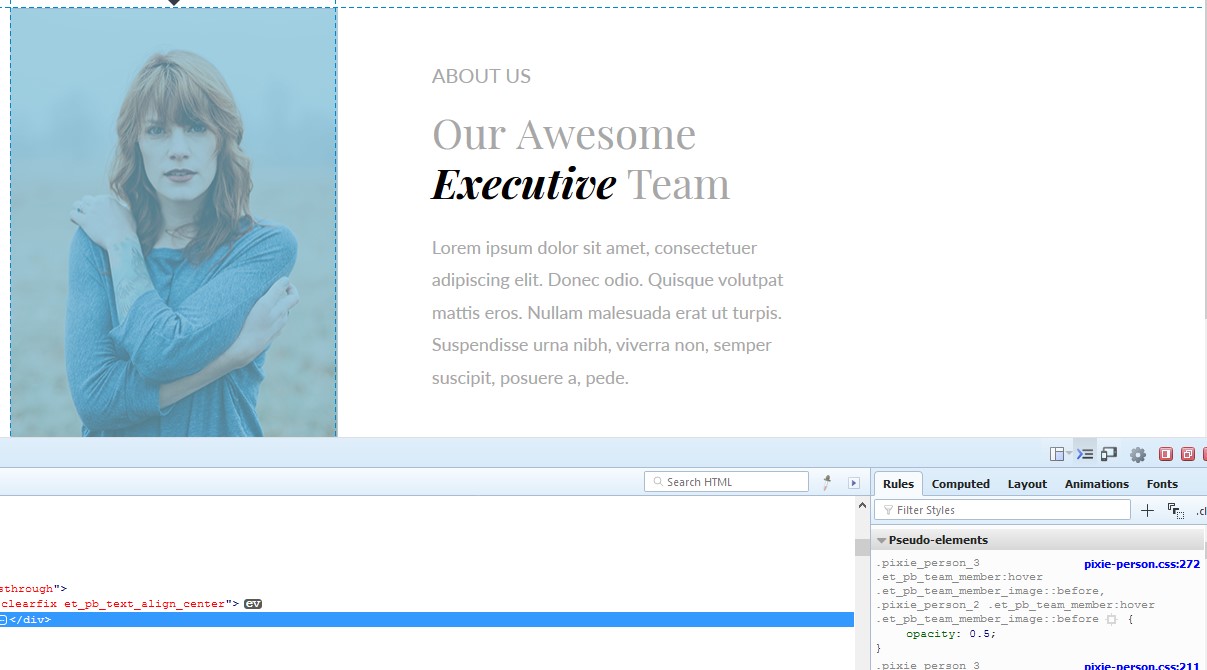 In the example you can see on the image, I have selected the image.On my right, I see opacity CSS rule, and also "pixie-person.css:272" text. That tells us this image has opacity rule assigned and it's written inside pixie-person.css file. It also tells us the line number, in this case it's 272**.** And this is exactly how you can discover where some design is.