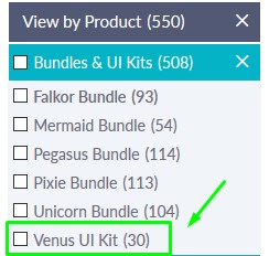 First thing you want to do is to filter only Venus layouts, and you can do that by toggling View by Product option, and then checking only Venus UI kit: