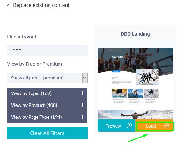 In the search box, look for "DDD" as shown on the screenshot, and once the layout appears, click the Load button to load it onto the page: