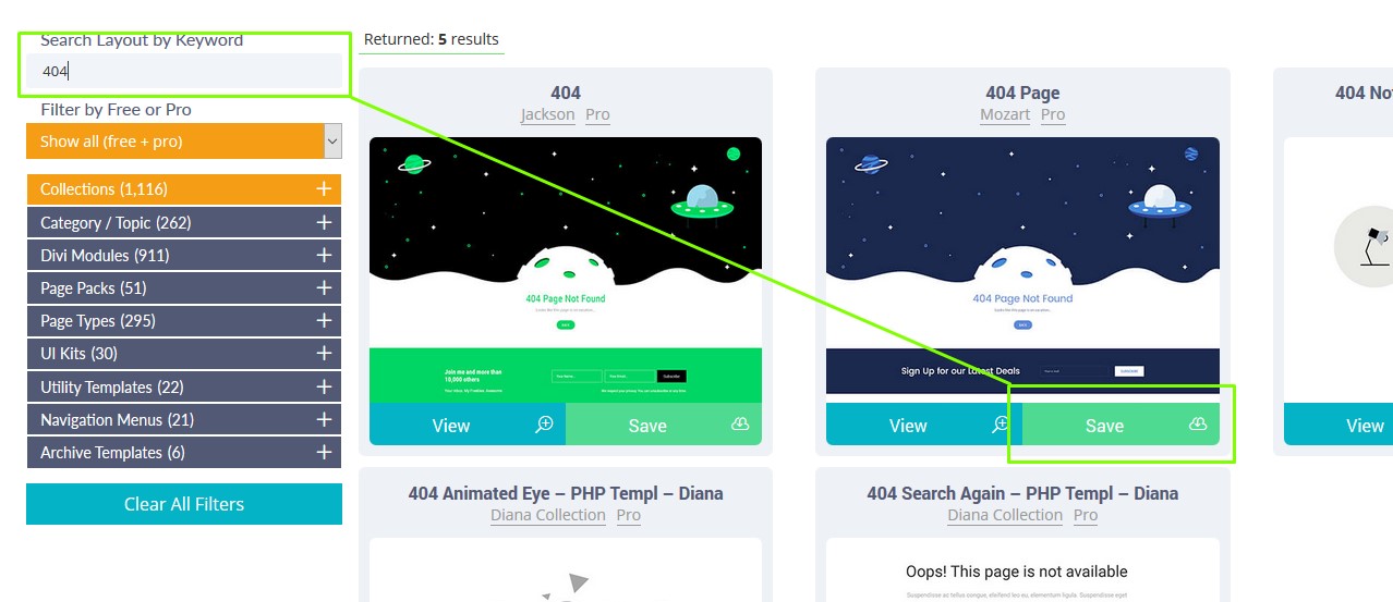 Go to Divi Den Pro, selectLayout Finder** tab, and using the Filters, find the layout you need.