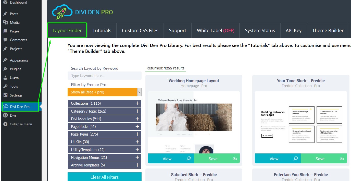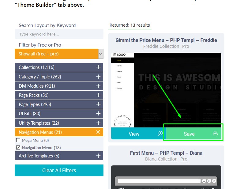 Go to Divi Den Pro, selectLayout Finder** tab, and using the Filters, find the menu you need.