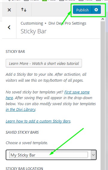 ToggleDivi Den Pro, then toggleSticky Bar**. From the drop-down menu, choose the sticky bar template you just created, and click the** Publishbutton.