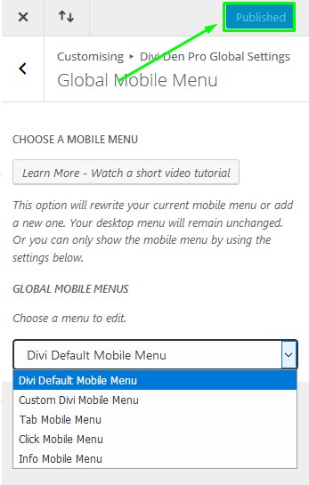 Divi Default Mobile Menu - Default mobile menu of the Divi theme.Custom Divi Mobile Menu - Default Divi mobile menu, with customization options.Tab Mobile Menu, Click Mobile Menu, Info Mobile menu - Premade mobile menus.