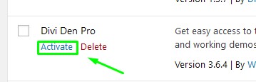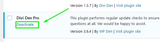Time to complete: 1 minutesIssue:My license key is not activating or shows the message "Deactivated" when I try to activate it. Solution: Sometimes the "old" API key information is stored in the WordPress database. The fix for this issue is really easy, we just need to force a refresh of the old information by De-activating, and then Re-activating the plugin.1. Deactivate Go to WP dashboard. Go to Plugins, and deactivate Divi Den Pro by clicking "Deactivate" link.